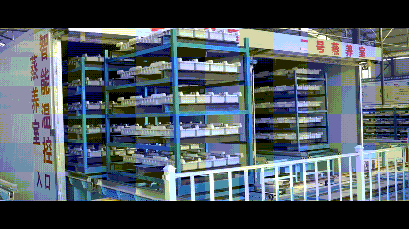 澆筑完成的混凝土托盤到達設定位置后,升降機內的伸縮貨叉伸出將托盤插起并升降,逐一將托盤放入5級貨架內,每個貨架堆滿完成后,由自動輸送線將貨架輸送至智能恒溫恒濕蒸養(yǎng)室養(yǎng)護。