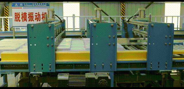 預制塊蒸養(yǎng)完成后,通過自動輸送線到達出庫升降機位置,升降機將成型的預制塊托盤插起并升降,逐一將5級貨架上托盤放入脫模輸送線,進入脫模區(qū)域。