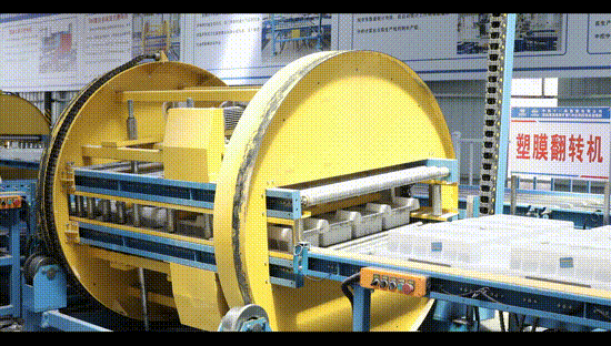 托盤模具清洗完成后,反向托盤進入自動鼠籠式翻轉機,光電對射傳感器檢測到位PLC給出指令,氣缸下壓,夾緊定位托盤,實現(xiàn)托盤翻轉180度。